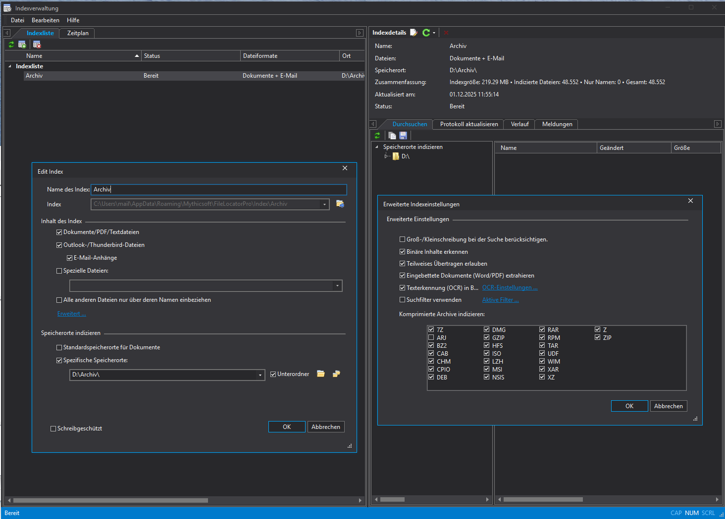 FileLocator Pro handles searches in compressed archives, email attachments, and offers OCR for scanned PDFs—just like FINDIT 6. Additionally, FileLocator Pro can create an index to speed up searches. In short: FileLocator Pro is an established, respected market leader in the professional segment. This makes a fair comparison on equal footing possible.